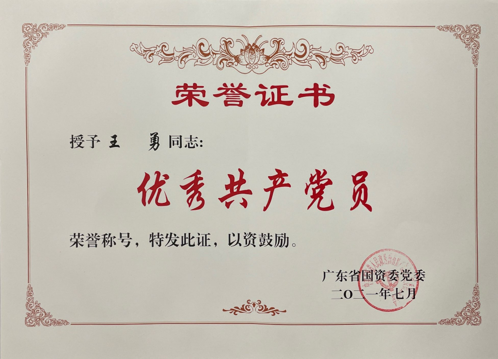 王勇榮獲廣東省國(guó)資委黨委表彰的“廣東省國(guó)資系統(tǒng)優(yōu)秀共產(chǎn)黨員”稱號(hào)。